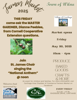 An event for children and families. For more information visit Carthage Area Chamber of Commerce Farmers Market on Facebook!